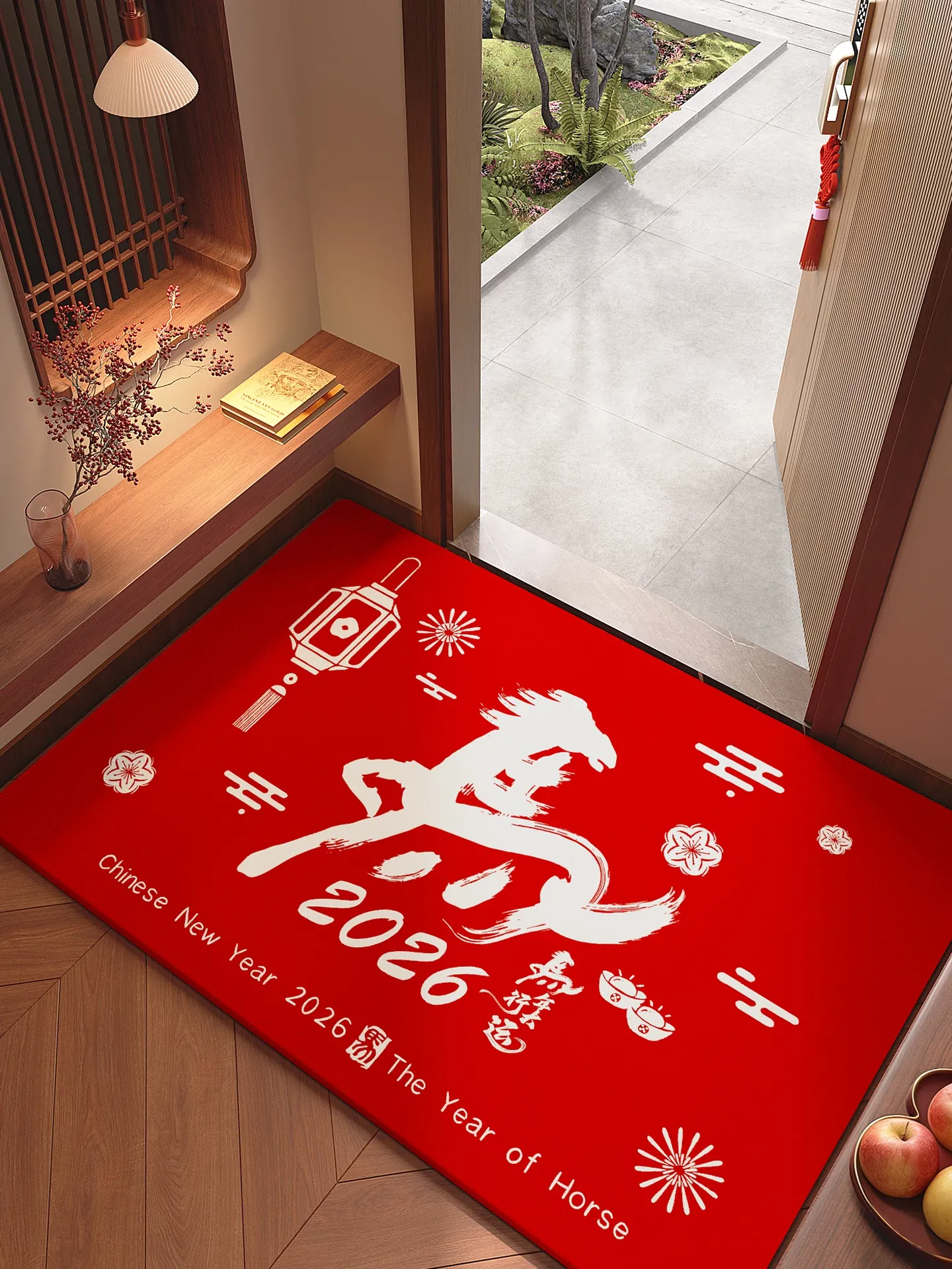2026年新作!馬年を祝う赤い玄関マット - お正月にぴったりの華やかなデザインで、幸運を呼び込む特別な一枚。新年の訪問者を迎えるための必需品!