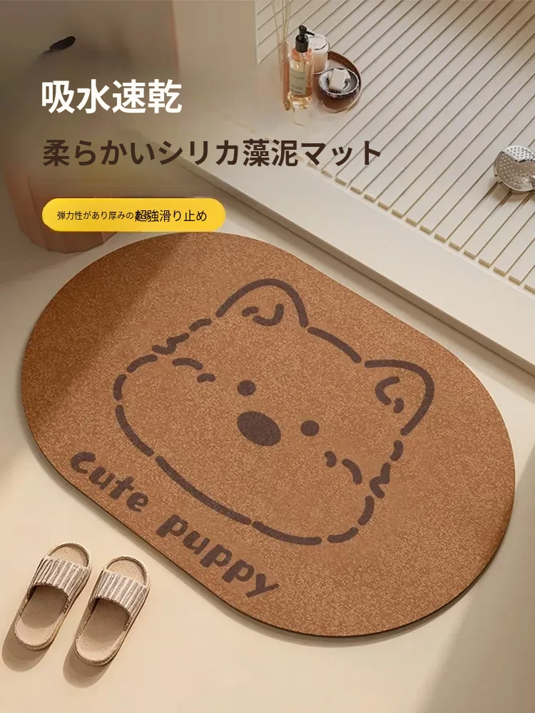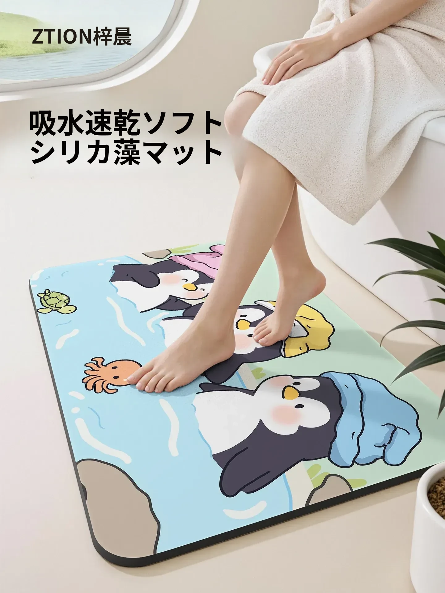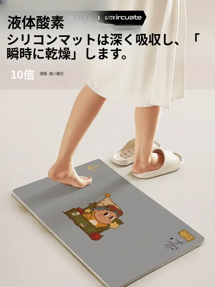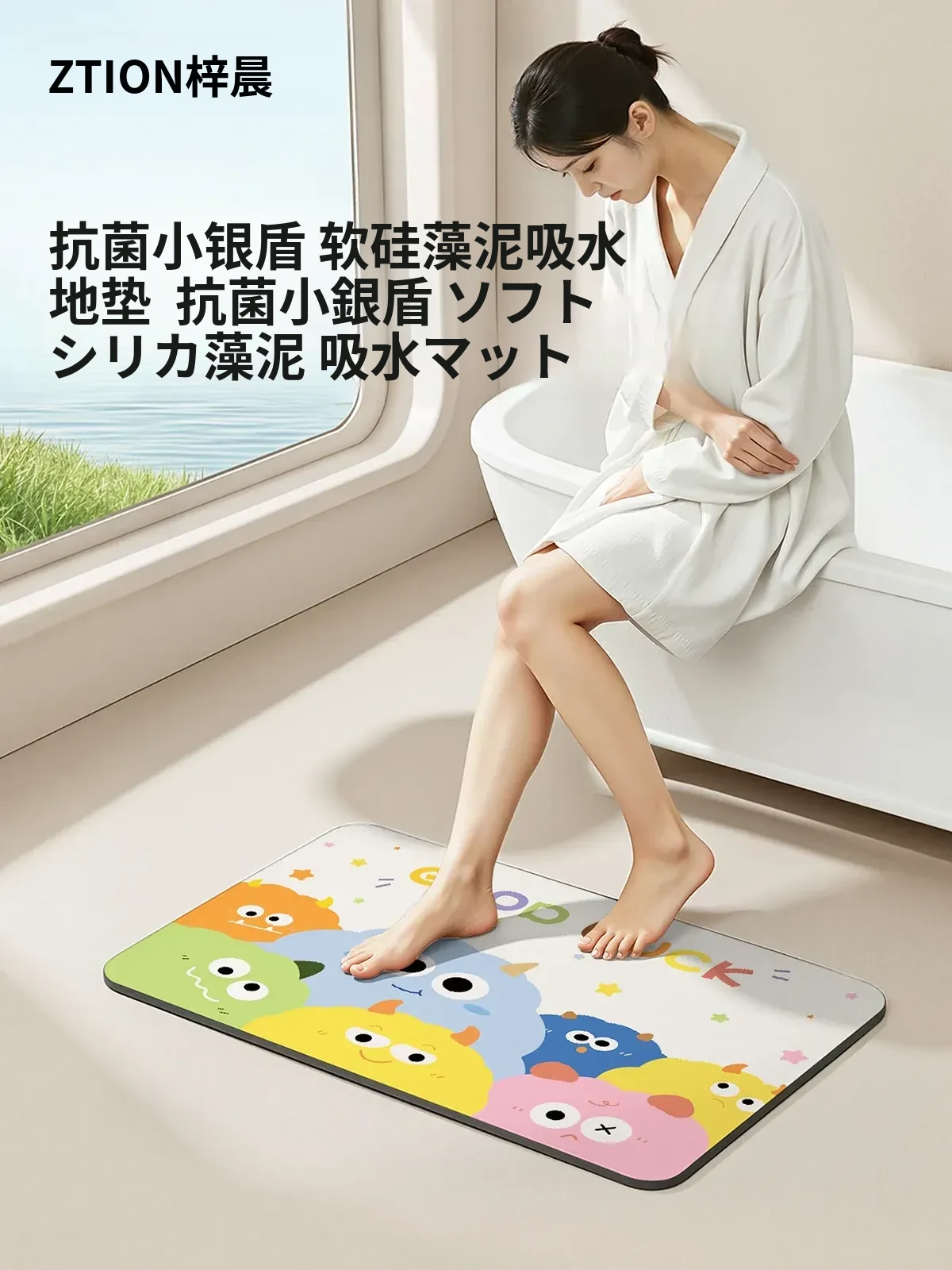 銀イオン入りカートゥーンデザインの浴室用シリカゲル吸水マット、速乾・滑り止め機能付き!トイレやシャワーの入口に最適な清潔感あふれるバスマットで、毎日のバスタイムをもっと快適に!